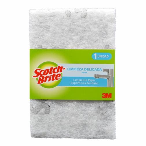 La fibra esponja Scotch-Brite® Cero Rayas, limpia y cuida las superficies delicadas y utensilios del baño removiendo residuos sin dañar.